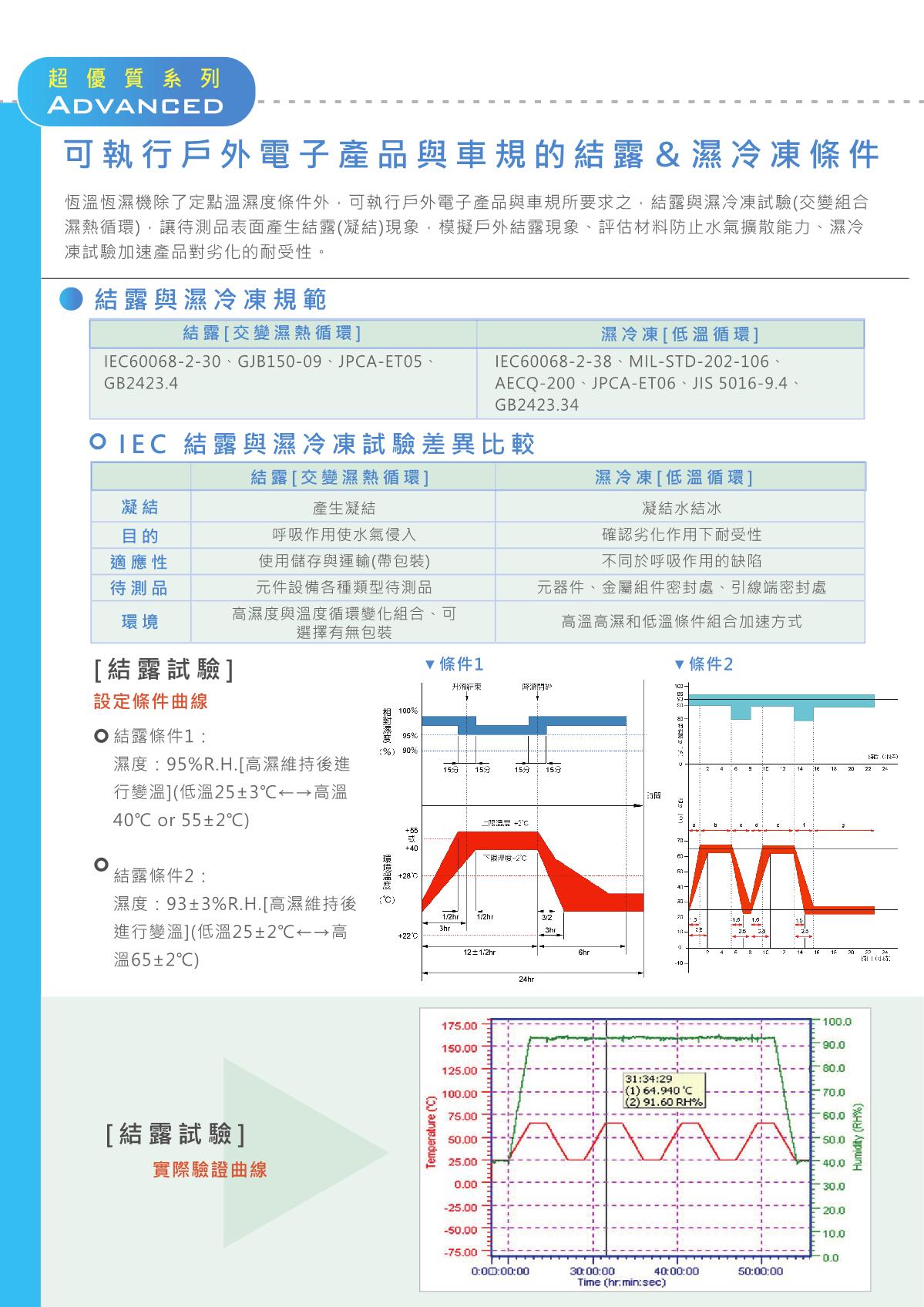 恒温恒湿机的目的为模拟产品在气候环境温湿组合条件下(高低温操作与储存、温度循环、高温高湿、低温低湿、结露试验…等),检测产品本身的调节能力与特性是否改变。需符合国际性规范之要求(IEC、JIS、GB、MIL…)以达到国际间量测程序一致性(含测试步骤、条件、方法)避免认知不同,并缩小测量不确定的因素范围发生。