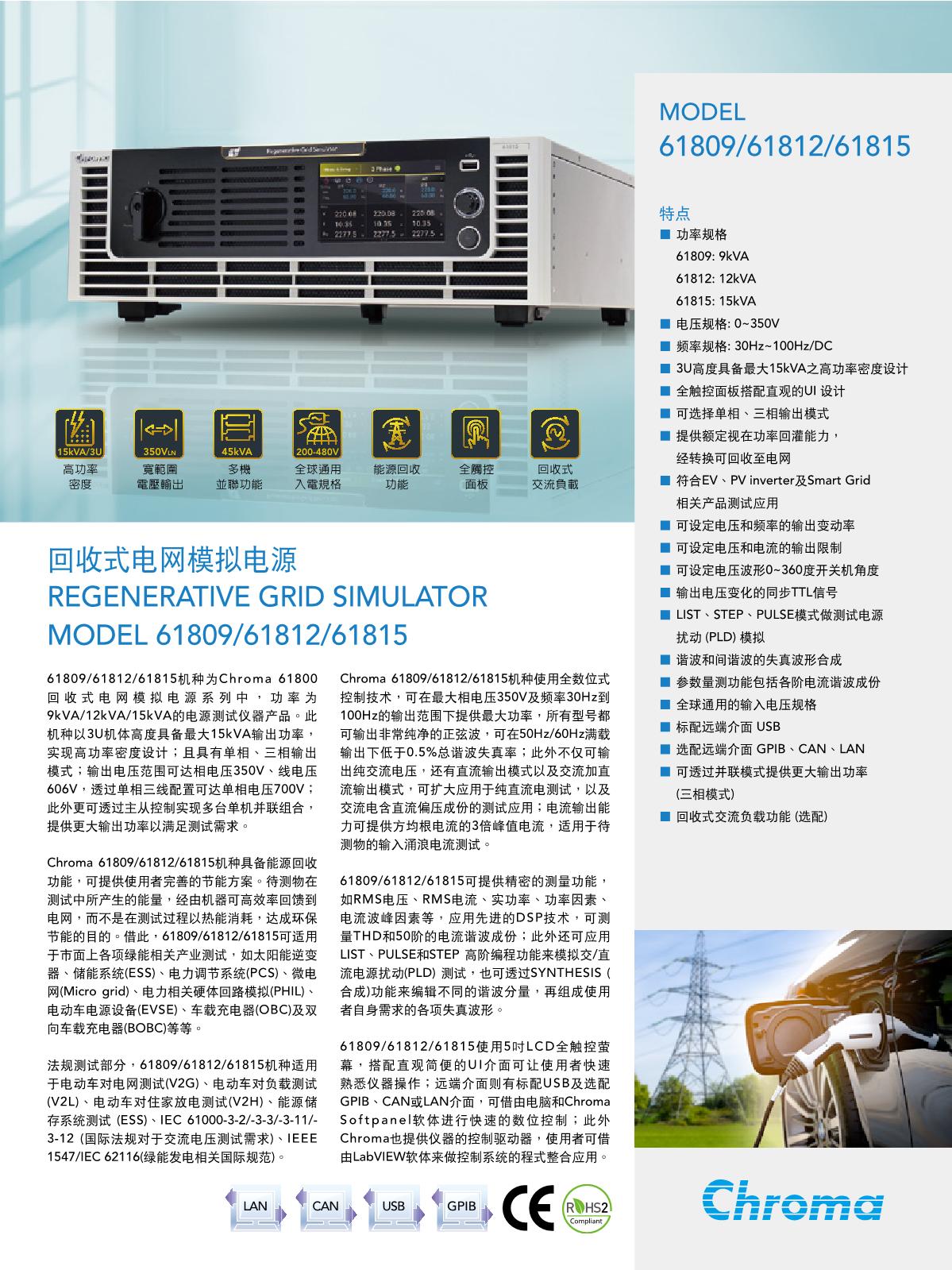61809/61812/61815機種為Chroma 61800回 收 式 電 網 模 擬 電 源 系 列 中 , 功 率 為9kVA/12kVA/15kVA的電源測試儀器產品。此機種以3U機體高度具備最大15kVA輸出功率,實現高功率密度設計;且具有單相、三相輸出模式;輸出電壓範圍可達相電壓350V、線電壓606V,透過單相三線配置可達單相電壓700V;此外更可透過主從控制實現多台單機並聯組合,提供更大輸出功率以滿足測試需求。